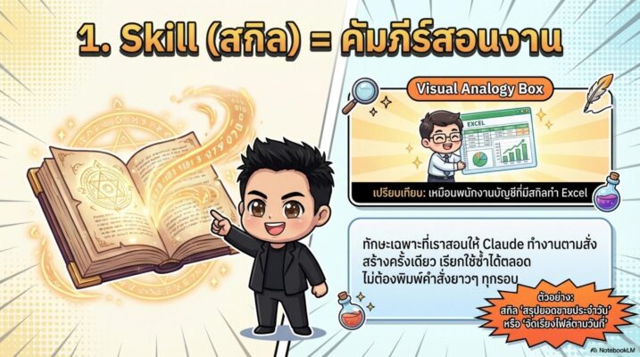ให้นึกภาพแบบนี้ครับ เหมือนพนักงานฝ่ายบัญชี ที่มีสกิลทำ Excel เป็น เราก็สอน Claude ให้มีสกิลแบบที่เราต้องการได้เหมือนกัน