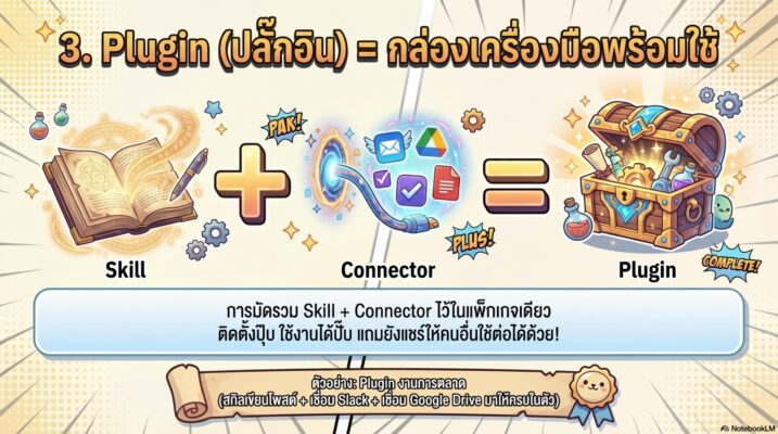 Plugin คือการรวม Skill หลายตัว + Connector + คำสั่งพิเศษต่างๆ ไว้ในแพ็กเกจเดียว