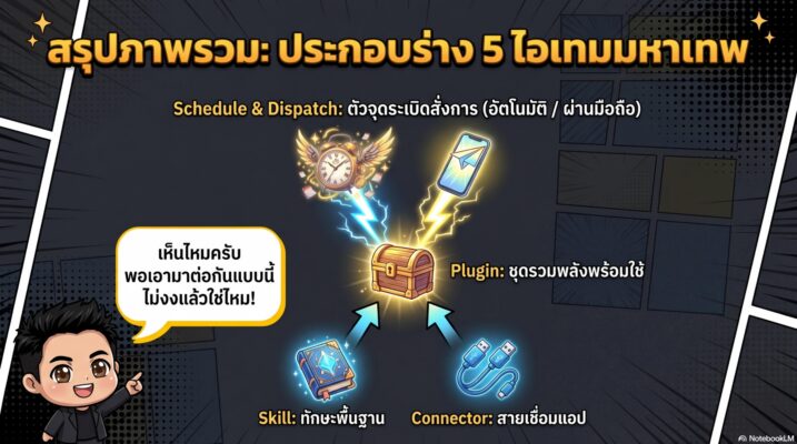 Skill คือทักษะพื้นฐานที่สอน Claude, Connector คือสายเชื่อมต่อกับแอปภายนอก, Plugin คือชุดรวมของ Skill + Connector ที่พร้อมใช้งาน, Schedule คือการตั้งเวลาให้ทุกอย่างทำงานอัตโนมัติ และ Dispatch คือการสั่งงานจากมือถือ โดยใช้ทุกอย่างข้างบนได้พร้อมกันเลย