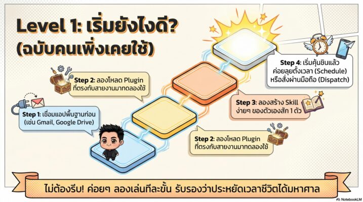 เริ่มจากติดตั้ง Connector ที่ใช้บ่อยก่อนเลย เช่น Gmail กับ Google Drive ต่อมาก็ลองติดตั้ง Plugin ที่ตรงกับงานของเรา แล้วค่อยสร้าง Skill ง่ายๆ สักตัวก่อน และเมื่อเริ่มชินแล้ว ค่อยมาเล่น Schedule กับ Dispatch ต่อได้เลยครับ