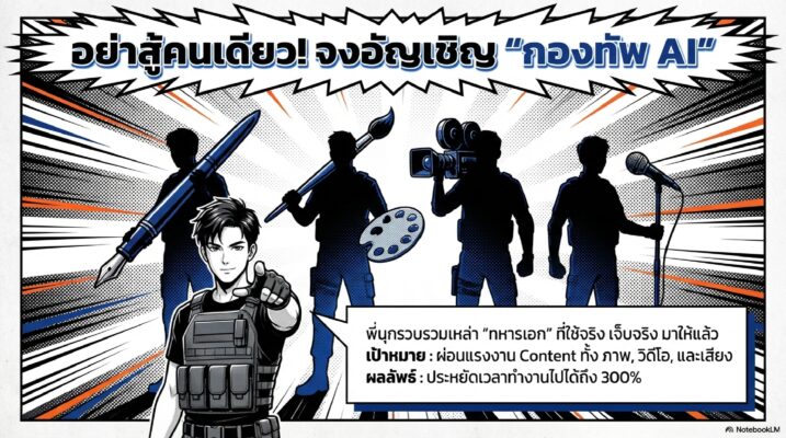 วันนี้พี่นุกเลยรวบรวม “กองทัพ เครื่องมือ AI Marketing” ที่พี่นุกใช้จริงเพื่อผ่อนแรงในการสร้าง “กองทัพ Content” ทั้งภาพ วิดีโอ และเสียง มาฝากกันแบบจัดเต็มครับ