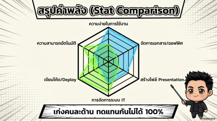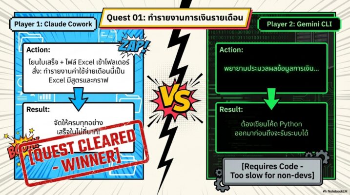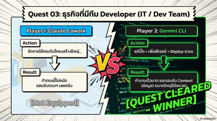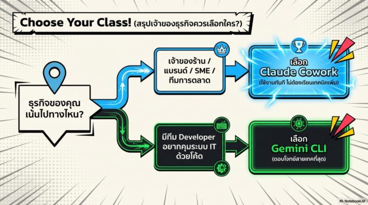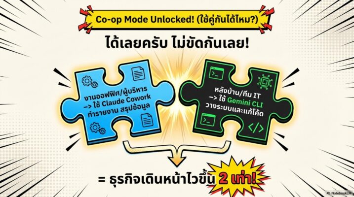 และถ้าถามว่า ใช้คู่กันได้มั้ย? ได้เลยครับ ไม่ขัดกันเลย เจ้าของธุรกิจหลายคนใช้ Claude Cowork ในงานออฟฟิศ แล้วให้ทีม IT ใช้ Gemini CLI ควบคู่กันไป