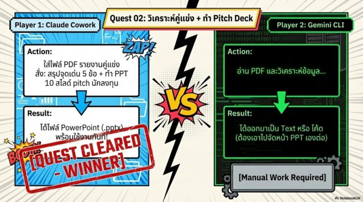 ถ้าใช้ Claude Cowork → ใส่ไฟล์ PDF รายงานคู่แข่งเข้าไป แล้วสั่ง “สรุปจุดเด่น 5 ข้อ แล้วทำ PowerPoint 10 สไลด์สำหรับ pitch นักลงทุน” ได้ไฟล์ PPT พร้อมใช้เลย ถ้าใช้ Gemini CLI → บางครั้งอาจจะได้แค่ Text หรือโค้ด ต้องไปทำ Power point เองต่อ แต่ถ้าจะได้ power point ออกมา ก็ต้องระบุ สไตล์ของสไลด์ให้ชัดเจน เพื่อความสวยงาม ถ้าไม่ระบุ มันจะออกมาเป็นตัวหนังสือ ที่ต้องไปจัดความสวยงามอีก