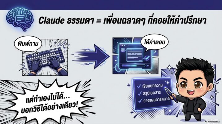 ถ้าจะเปรียบง่ายๆ Claude ธรรมดา = เพื่อนฉลาดๆ ที่คอยคิดและบอกวิธีให้เรา