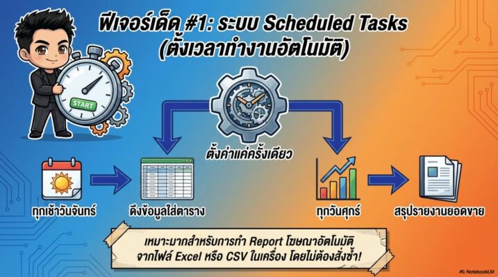 เช่น ให้สรุปรายงานยอดขายทุกวันศุกร์ หรือ ดึงข้อมูลมาใส่ตารางทุกเช้าวันจันทร์ ตั้งครั้งเดียวแล้วปล่อยให้มันทำเอง