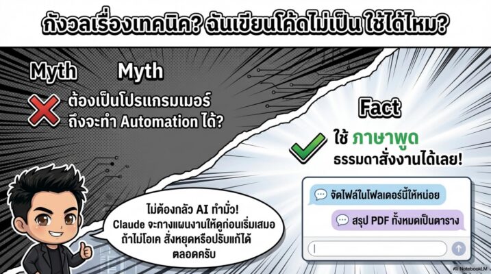 Q3: ต้องเป็นสายเทคนิคถึงจะใช้ Cowork ได้มั้ย? ไม่จำเป็นเลยครับ Cowork ออกแบบมาสำหรับคนที่ไม่ได้เขียนโค้ด บอกงานเป็นภาษาพูดธรรมดาได้เลย เช่น “จัดไฟล์ในโฟลเดอร์นี้ให้หน่อย” หรือ “สรุป PDF ทั้งหมดในโฟลเดอร์นี้เป็นตาราง” Claude จะวางแผนและทำให้เองครับ