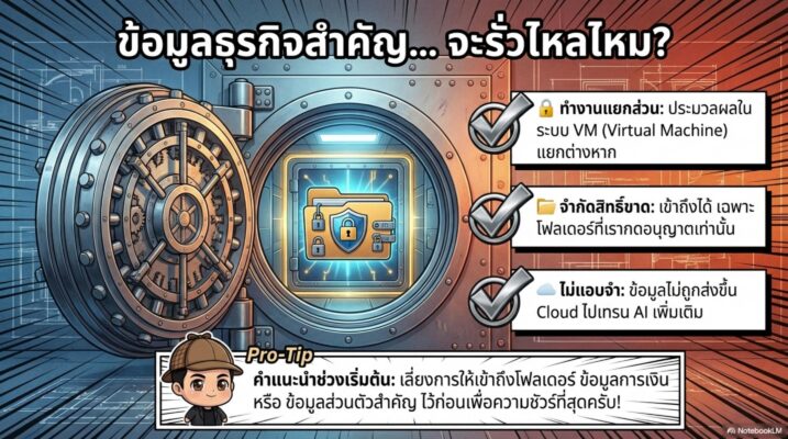 Q2: ข้อมูลธุรกิจที่ให้ Cowork เข้าถึงจะรั่วไหลมั้ย? ปลอดภัยครับ Cowork ทำงานในระบบ VM ที่แยกออกมาต่างหาก และเข้าถึงได้เฉพาะโฟลเดอร์ที่เราอนุญาตเท่านั้น ข้อมูลไม่ได้ถูกส่งขึ้น Cloud หรือนำไปเทรน AI เพิ่มเติมครับ แต่พี่นุกแนะนำให้หลีกเลี่ยงโฟลเดอร์ที่มีข้อมูลการเงินหรือข้อมูลส่วนตัวสำคัญไว้ก่อนในช่วงนี้นะครับ