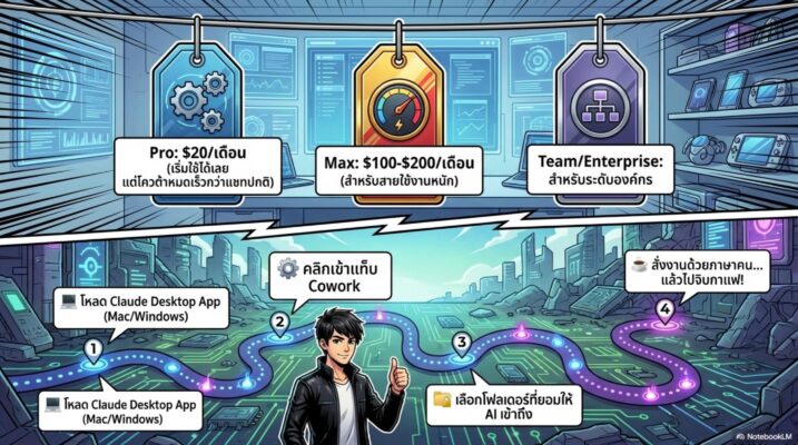 Cowork มีให้ใช้ในแผน Pro ($20/เดือน), Max ($100-200/เดือน), Team และ Enterprise โดยใช้งานผ่าน Claude Desktop App บน macOS หรือ Windows