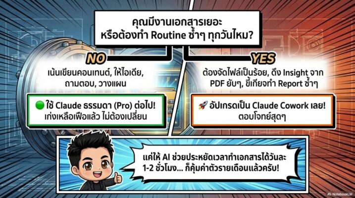Q3: คุ้มมั้ยที่เจ้าของธุรกิจจะจ่ายเพิ่มเพื่อใช้ Cowork? ขึ้นอยู่กับว่างานประจำวันของเราหนักแค่ไหนครับ ถ้าแต่ละวันมีงานจัดการเอกสาร สรุปรายงาน หรือทำ Routine ซ้ำๆ เยอะ แค่ประหยัดเวลาได้วันละ 1-2 ชั่วโมง ก็คุ้มค่าแล้ว แต่ถ้าใช้แค่เขียนคอนเทนต์หรือถามคำถามทั่วไป แผน Pro ธรรมดาก็เพียงพอครับ