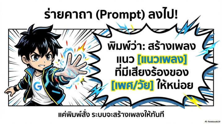ขั้นตอนที่ 2: ใส่ Prompt บอกความต้องการของเราไปเลยครับ เช่น “สร้างเพลงแนว (แนวเพลง) ที่มีเสียงร้องของ (ระบุเพศ/วัย) ให้หน่อย”
