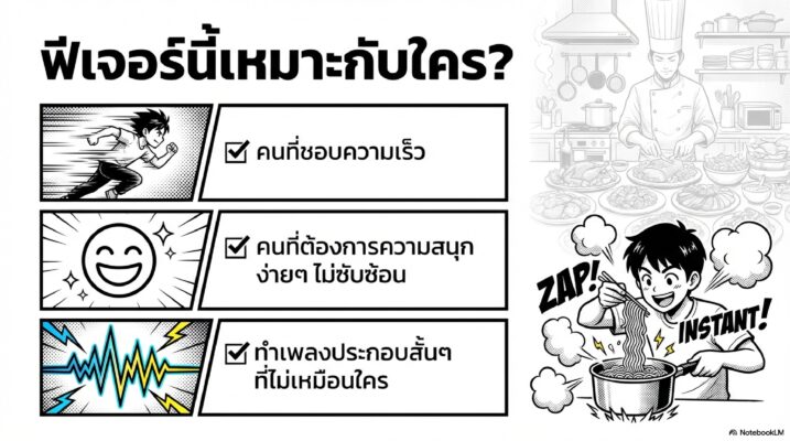 Q3: ธุรกิจแบบไหน ที่จะได้ประโยชน์จากฟีเจอร์นี้มากที่สุด? A: ธุรกิจที่ต้องทำ Content บ่อยๆ ได้ประโยชน์สุดครับ ไม่ว่าจะเป็นร้านค้าออนไลน์ที่ยิงแอด TikTok / Facebook, แบรนด์ที่ต้องการเพลง Jingle สั้นๆ ประกอบโฆษณา หรือเจ้าของธุรกิจที่ทำคลิปรีวิวสินค้าเอง แบบนี้ใช้แล้วคุ้มมากๆ เพราะได้เพลงใหม่ทุกครั้งโดยไม่ต้องรอ ไม่ต้องจ่ายเพิ่มครับ