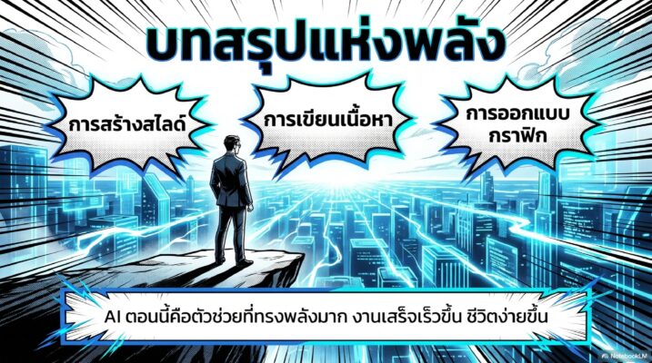 AI ตอนนี้คือตัวช่วยในการทำ Content ที่ทรงพลังมากๆ เลยครับ ไม่ว่าจะเป็นการสร้างสไลด์ การเขียนเนื้อหา หรือการออกแบบกราฟิก