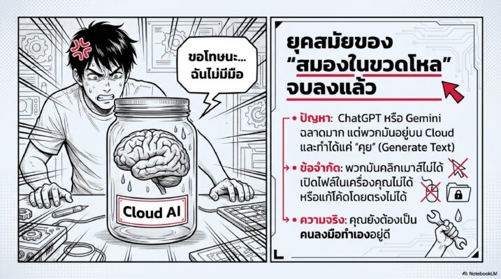 ถ้าเปรียบเทียบง่ายๆ AI ทั่วไปอย่าง ChatGPT หรือ Google Gemini เป็นเหมือน “สมอง” ที่อยู่ในโหลแก้ว (บนคลาวด์) เอาไว้ปรึกษาหรือขอข้อมูล