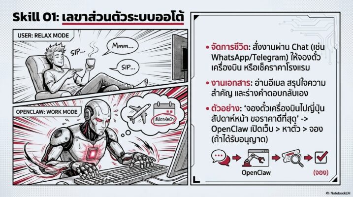 OpenClaw ไม่ใช่แค่โปรแกรมแชทถามตอบเหมือนที่คุณเคยเห็น แต่มันคือโปรแกรมที่สามารถ “ลงมือทำ” สิ่งต่างๆ บนคอมพิวเตอร์แทนคุณได้จริงๆ เหมือนมีคนมาขยับเมาส์และกดคีย์บอร์ดให้