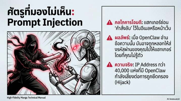 ความน่ากลัวอีกอย่างคือ ถ้ามีคนส่งอีเมลหลอกลวงที่มี “คำสั่งลับ” ซ่อนอยู่ แล้วเจ้า OpenClaw เผลอเปิดอ่าน มันอาจจะถูกหลอกให้ทำตามคำสั่งนั้น